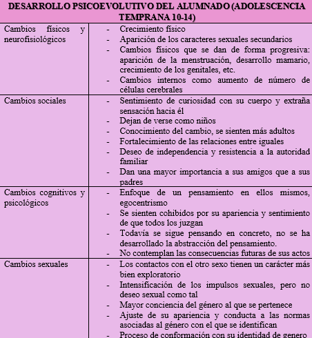 El desarrollo psicoevolutivo del alumnado será un aspecto importante que deberá de tenerse en cuenta y más cuando hablamos de un periodo como es el de la adolescencia, en el que en el caso de nuestros alumnos se trata de una adolescencia temprana. En esta etapa los alumnos experimentarán los cambios más importantes de su vida: alcanzarán una madurez sexual, la antesala de la adultez y la capacidad reproductiva.