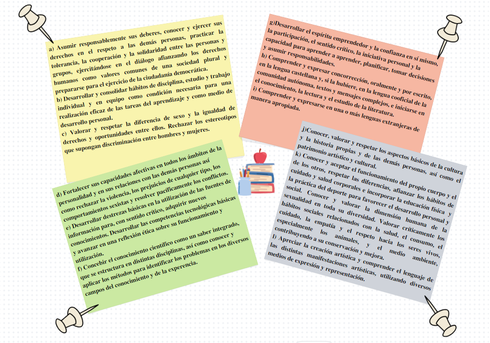 Estando vigente la Ley Orgánica 3/2020, de 29 de noviembre, y en concretamente el Real Decreto de 217/2022, de 29 de marzo, artículo 7, establece un aprendizaje competencial, autónomo, significativo y reflexivo en las materias correspondientes a la Educación Secundaria Obligatoria. De esta forma, los objetivos que deberán desarrollar los alumnos y alumnas respecto a esta situación de aprendizaje una vez finalizada este etapa son: