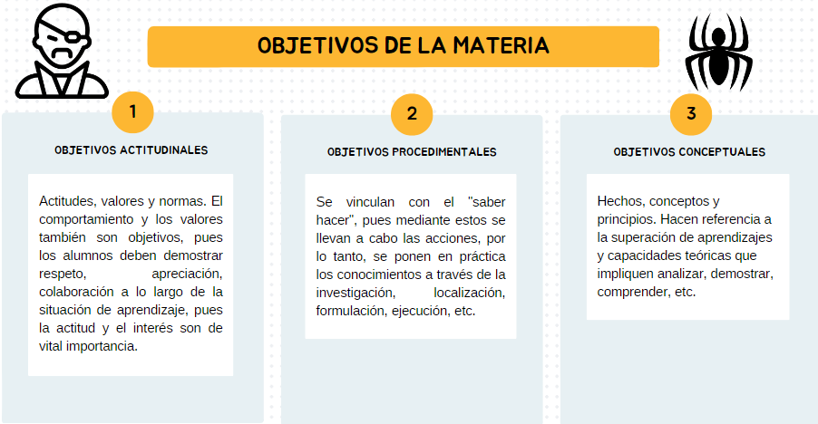 Estos objetivos se caracterizan por ser definidos por el profesor en cuestión, dependiendo de los conocimientos del alumnado en cuestión y adaptados a la situación de aprendizaje. Estos deben ser definidos por un verbo en infinitivo, y, según este los clasificamos en tres apartados, como veremos a continuación.